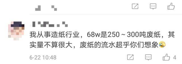 对于不少网友惊讶于废纸原来那么值钱,有从事造纸行业的网友表示,68万元的废纸大约在250吨-300吨左右,在废纸行业来看,量并不算大。