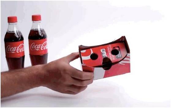 仅通过三个步骤,就能把普通的可乐包装盒,打造成一个虚拟头套设备。去年VR概念最为火热的阶段,可口可乐就凑了这个热点。
