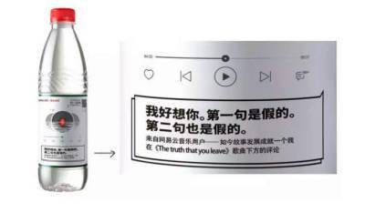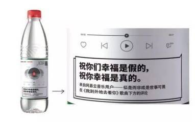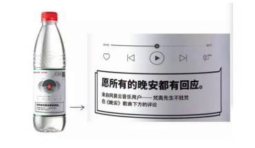 网易云音乐,就把农夫山泉的瓶身,当成了一个独立的媒介渠道,与农夫山泉联合推出合作限量款“乐瓶”,将30条精选乐评印制在4亿瓶农夫山泉上,让每一瓶水都自带音乐和故事。