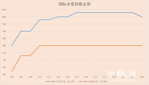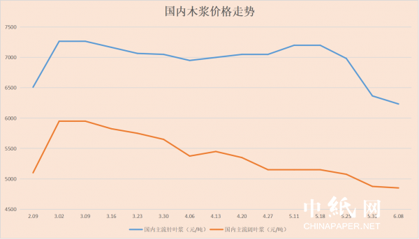 5月中旬以来,浆价一直处于下跌趋势,主要受到这些因素影响。目前各类成品纸库存充足,有的渠道内库存甚至维持在50—60天。据了解北方一大港口上月末库存约46万吨,目前已经达到54万吨,所以短期内对纸浆需求并不急切,导致浆厂推涨浆价困难,并且具有下跌趋势。同时618电商促销活动即将结束,由此带来的包装订单也将大幅减少,纸浆需求也随之减少。在造纸行业淡季行情背景下,各类成品纸价格持续下跌,纸厂更加严格控制采购成本,连前期报价相对坚挺的针叶浆价格也开始下跌,针、阔叶浆价差开始逐步减小。
