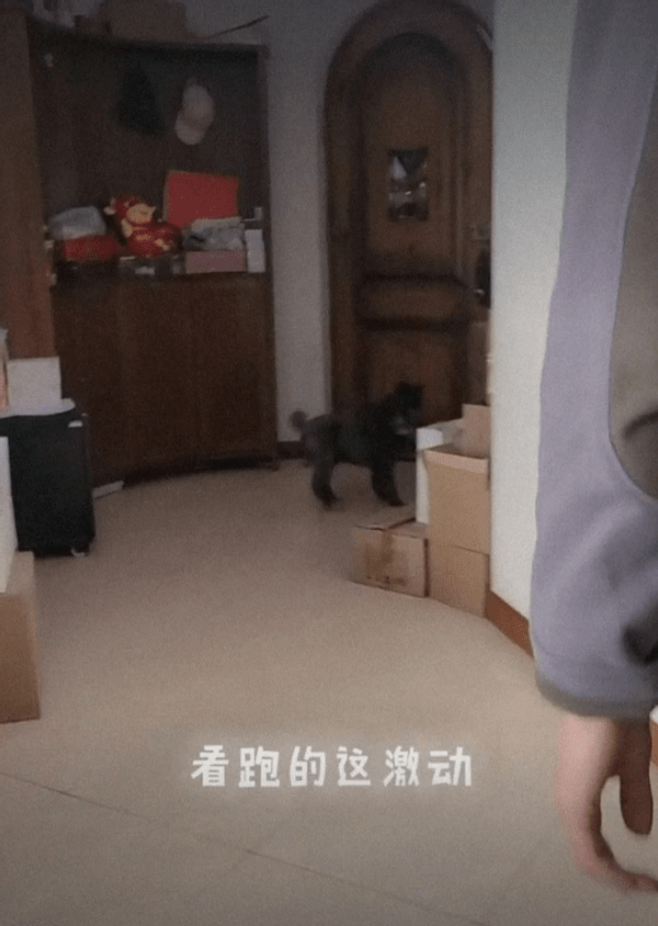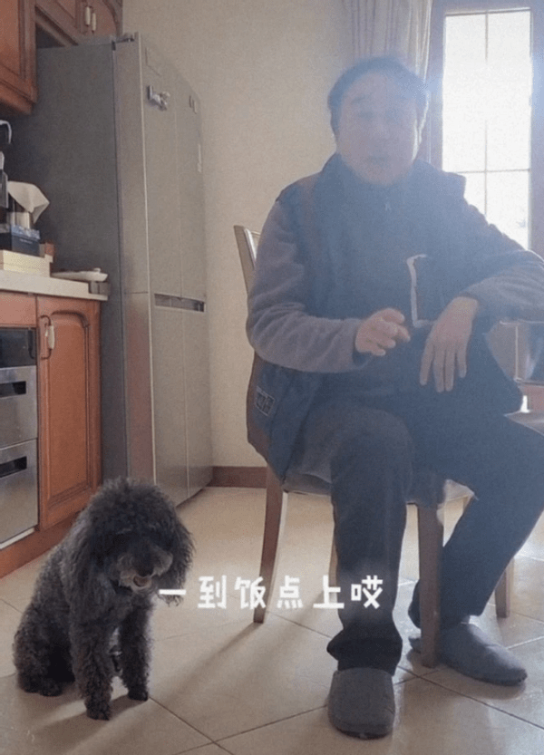 视频中,冯巩穿着灰色外套、蓝色背心和黑色休闲裤,坐在椅子上逗狗。也许是该走了,狗狗在房间里急切的跑来跑去,仿佛在提醒主人,该出去走走了。当狗跑出来的时候,摄像机一直在动。大门必须经过的地方有一个简单而古老的大柜子,周围还有随意摆放的纸箱和黑色破烂的大门。