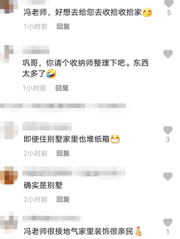 看完视频,网友在评论区留言,说冯巩家看起来有点乱,建议他找个收纳科整理一下。另外,有网友说,冯巩虽然住别墅,但家里还是堆满了纸箱,家具也是90年代的怀旧,真的很接地气!