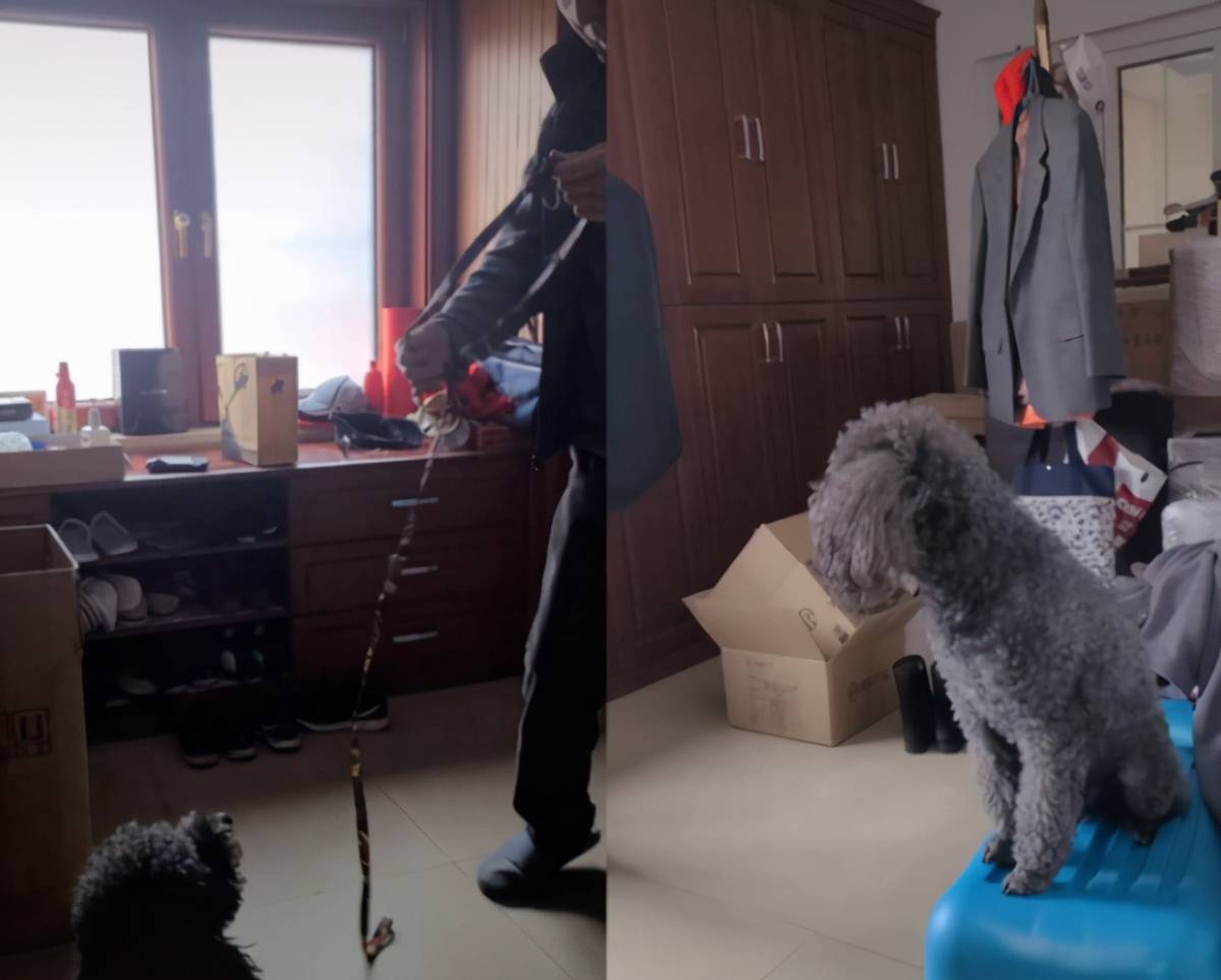 冯巩去拿狗带的时候,镜子里出现的房间就更乱了,光是放在地上的纸箱和包就占了很大面积。衣架上挂着一套干净的灰色西装,鞋柜满满的,柜台上堆着一些杂物。看起来有点乱,但是很热闹。