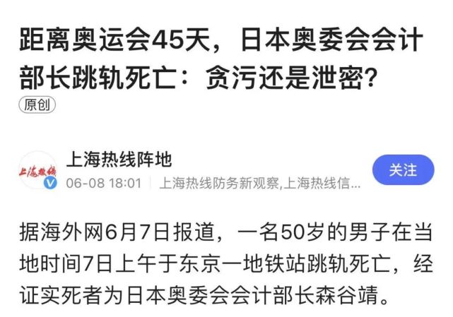 上海热线阵地, “距离奥运会45天,日本奥委会会计部长跳轨自杀:贪污还是泄密?”, 2021-06-08