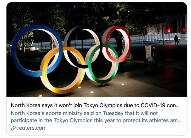 “朝鲜奥委会决定不参加第32届奥运会,以保护运动员不受由新冠病毒造成的全球公共卫生危机的影响”。