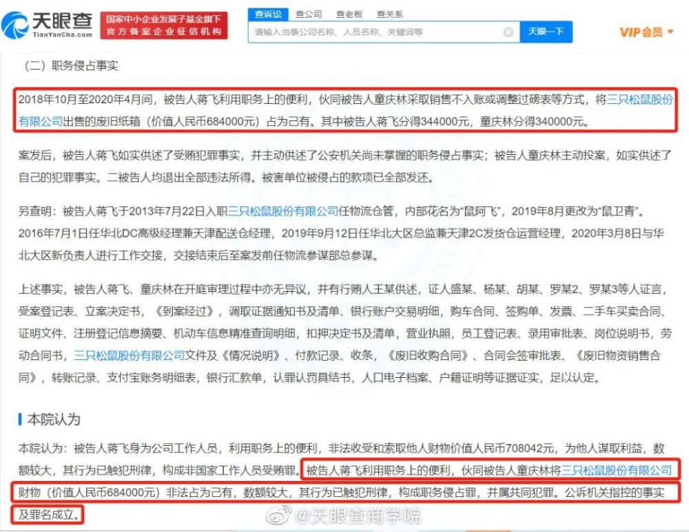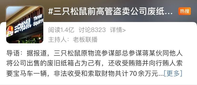 今年6月份裁判文书网公开了一份判决,随即#三只松鼠前高管盗卖废纸箱被判刑#冲上了微博热搜。