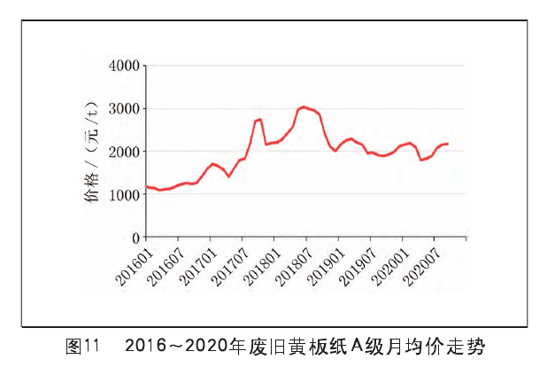 拿国废黄板纸来说,自2016年9月开始价格呈持续上涨态势。据卓创资讯监测数据显示,2020年国废黄板纸A级到厂价均价为2037元/吨。