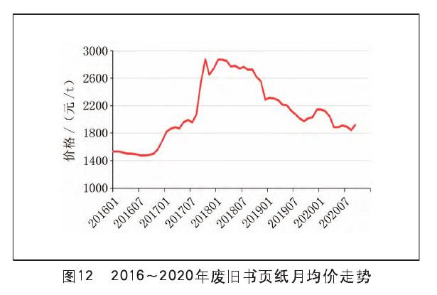 国废书页纸价格整体也呈现冲高走势,据卓创资讯监测数据显示,2020年国废书页纸均价为1963元/吨。