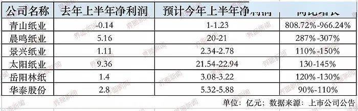 晨鸣纸业(000488.SZ)、景兴纸业(002067.SZ)紧随其后,两者预计今年上半年将实现净利润至多分别为21亿元和2.78亿元,同比至多将增长307%和150%。