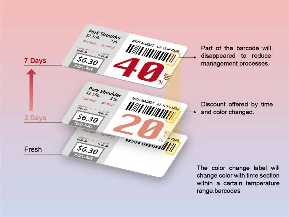 ”Barcodiscount“会随着时间变色以及标签上的折扣度也会随之更改,这样的设计不单减少了反复贴标签的人力,也节约下纸张,同时还满足商品临期,促销力度越大的规律,能很好地提高销量。