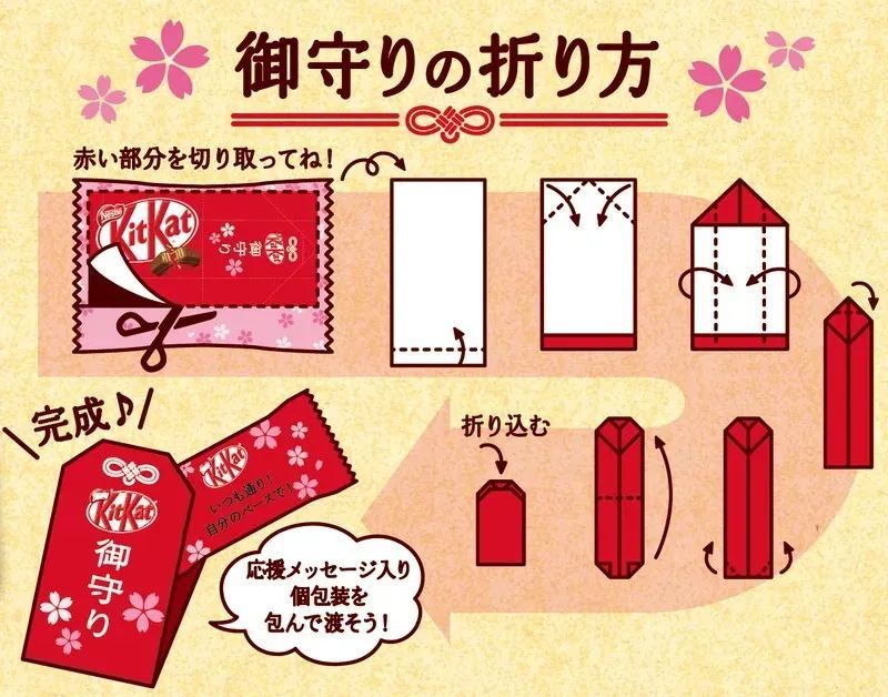 2019年11月,KitKat着眼于下一年的入学考试季节,从纸鹤转变为支持学生入学考试的御守(日语omamori,是日本最传统的幸运符之一,常见于日本寺庙和神社),御守可用于收纳一小块kitkat巧克力。同时,每个kitkat独立小包装上采用寓意吉祥的红白拼色,印有鼓励学生考试的祝福语。