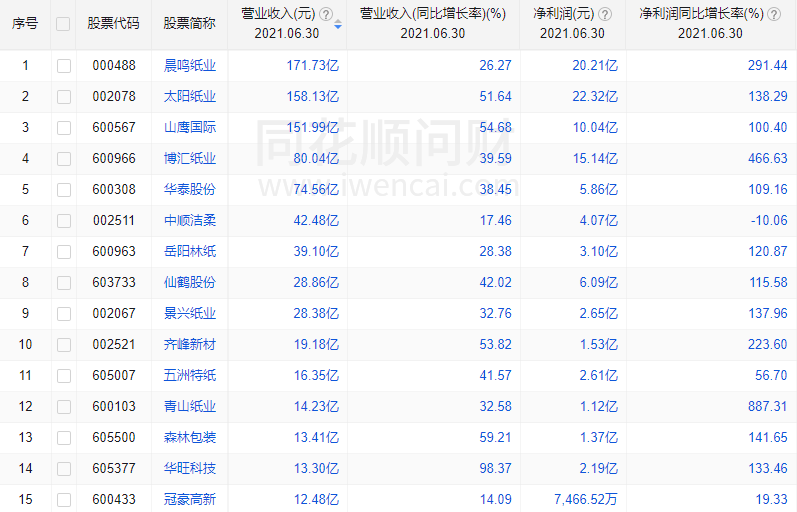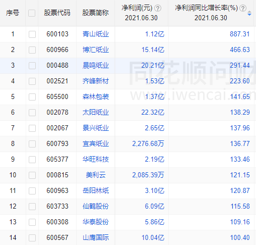 在盈利增速方面,21家净利润实现正增长,其中净利润同比增长超过100%的有14家,青山纸业增幅最大,同比上升887.31%。
