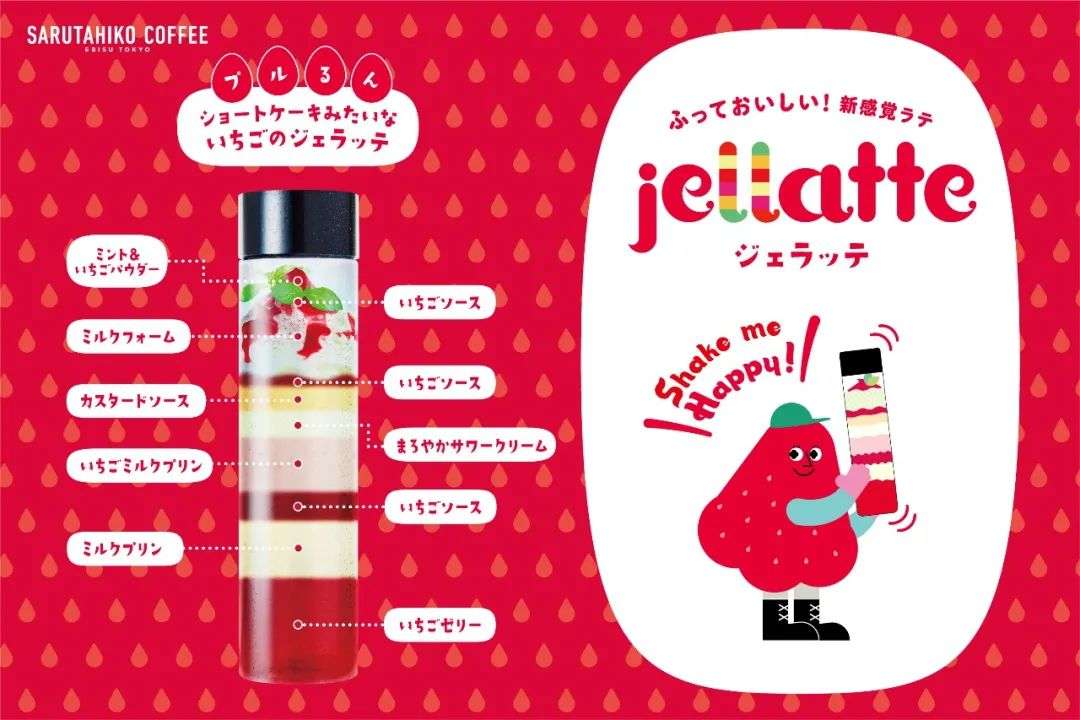 据悉,为了不停带给消费者无与伦比的新鲜感,Sarutahiko Coffee每个季度都会更换一次Jellatte的口味。今年2月已推至第三弹,迎合草莓季的「如同超弹力草莓蛋糕一般的草莓果冻拿铁」将食材增至9层,散落各层的草莓红令人感受到早春气息。