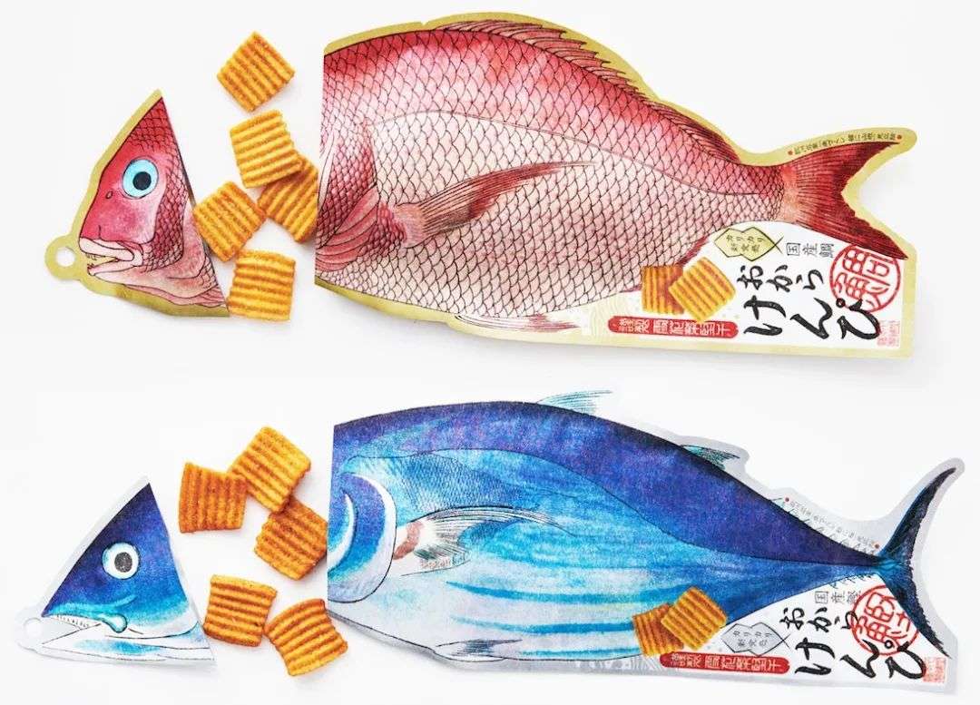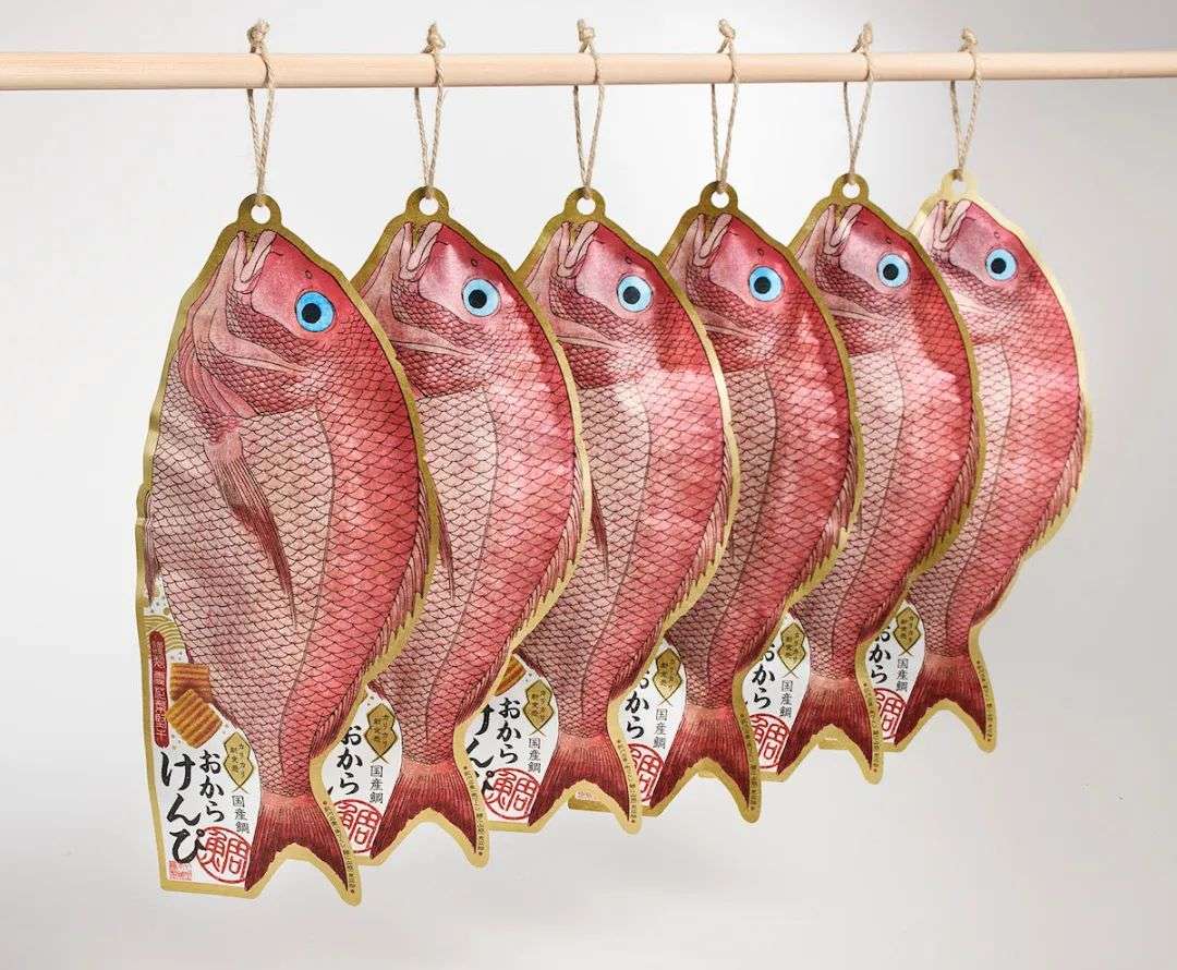 2020年,日本一心堂本铺发行了一款与众不同的豆渣煎饼。产品没有和普通煎饼一样使用方形包装袋,而是选用具有浓郁日本传统文化风格的鯛鱼袋。