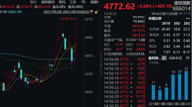 Wind数据显示,截至9月23日收盘,造纸板块24家上市公司中,有17家上市公司股价涨停。造纸指数报收4772.62点,涨幅达9.28%。