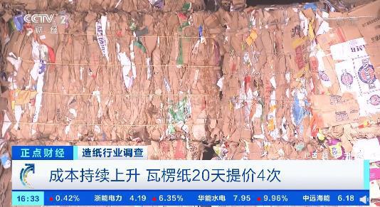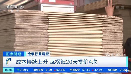 据央视财经报道,在山东一家纸企了解到,今年8月以来,该企业生产的瓦楞纸,不到20天就连续四次提价。每吨的出厂价从3680元直接上涨到接近4000元。