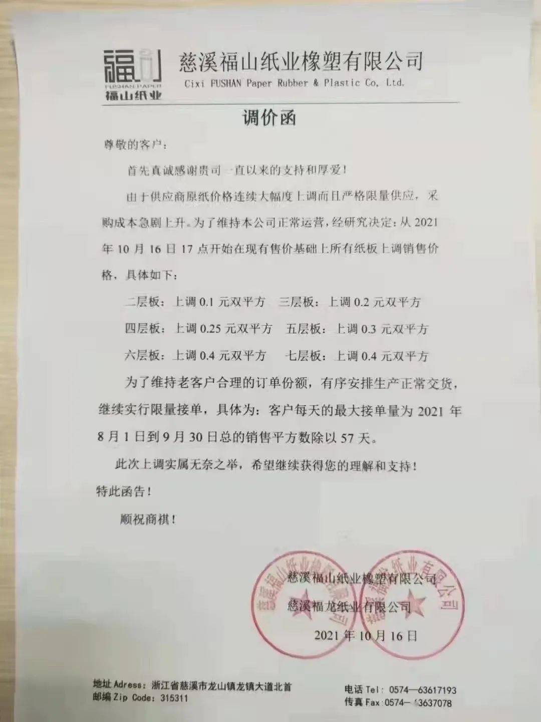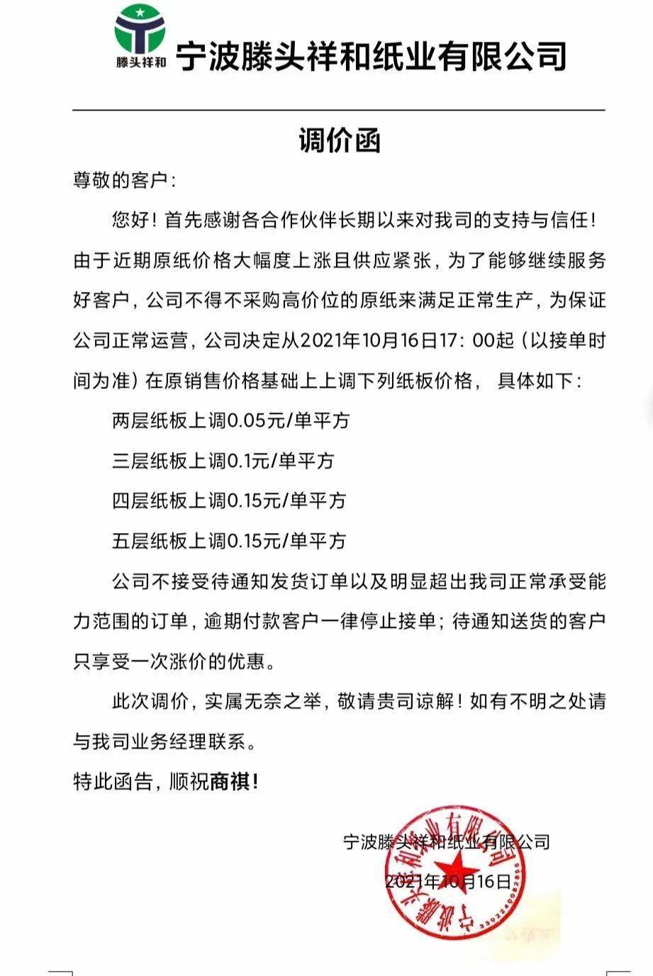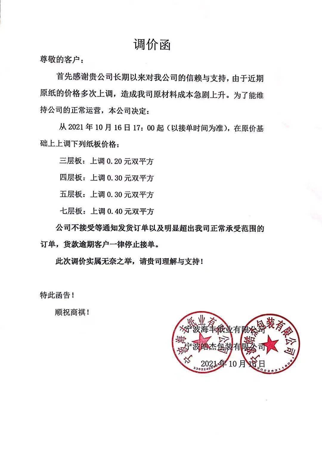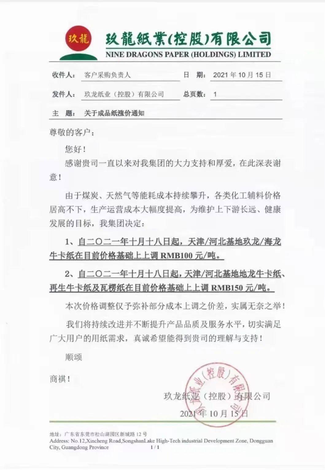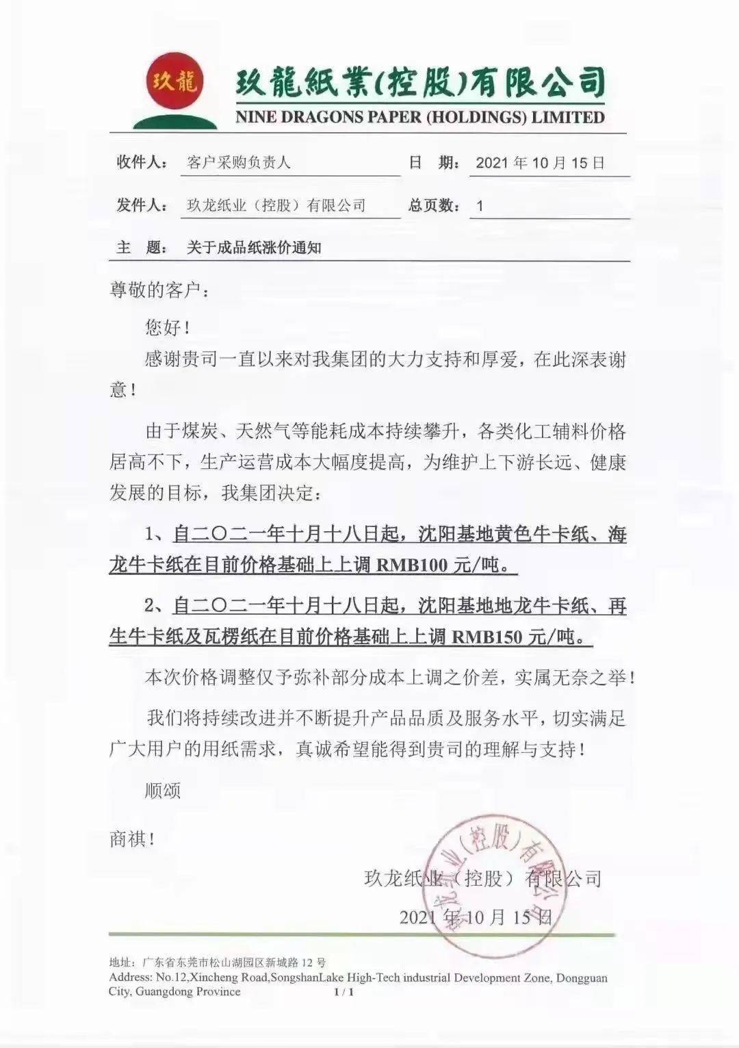 沈阳玖龙:10月18日起,黄色牛卡纸、海龙牛卡纸上调RMB 100元/吨。地龙牛卡纸、再生牛卡纸及瓦楞纸上调RMB 150元/吨。