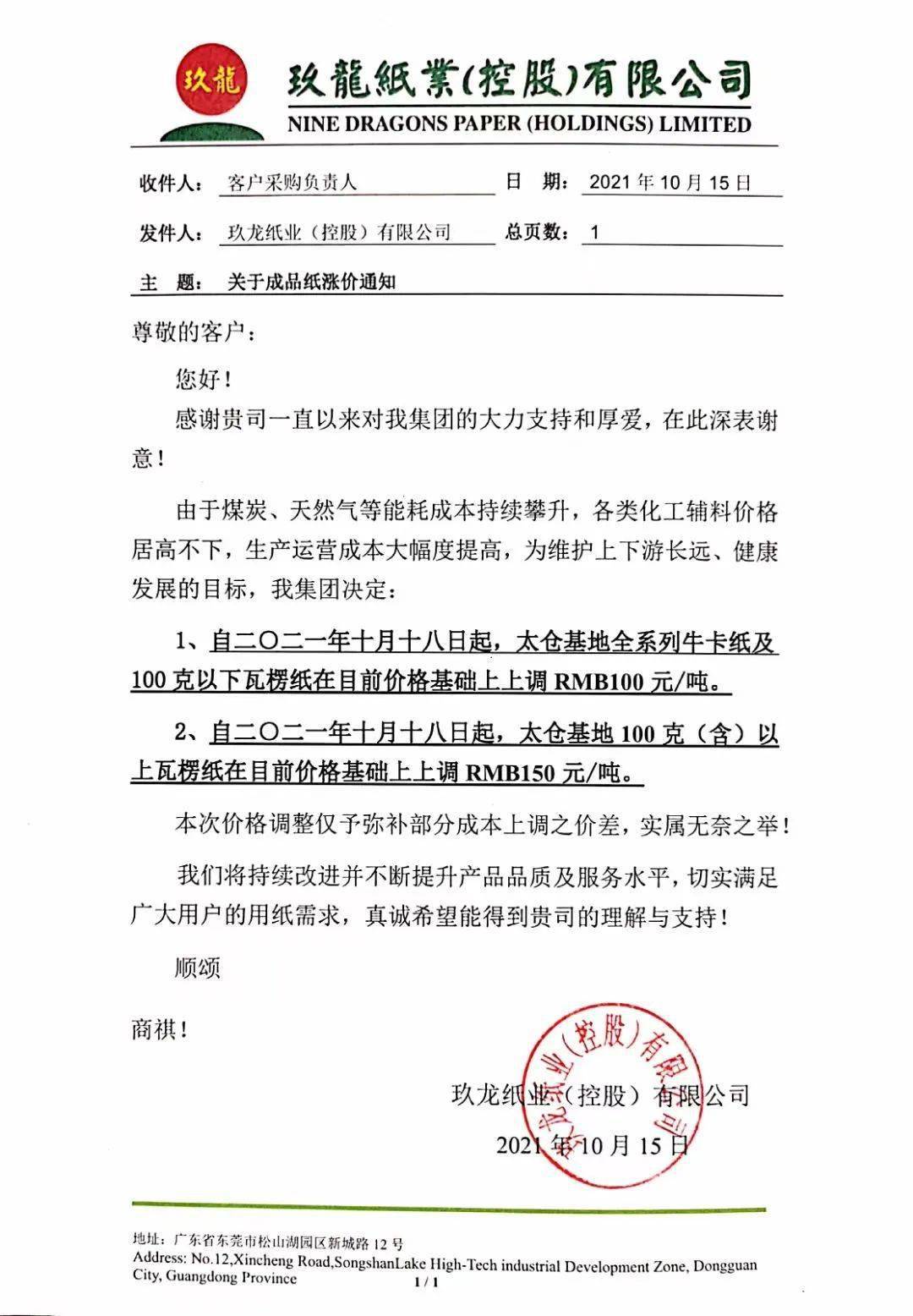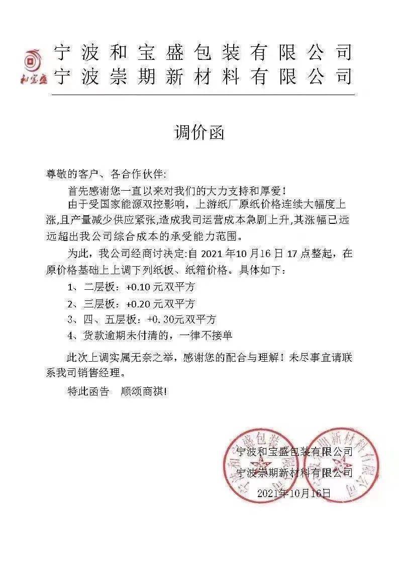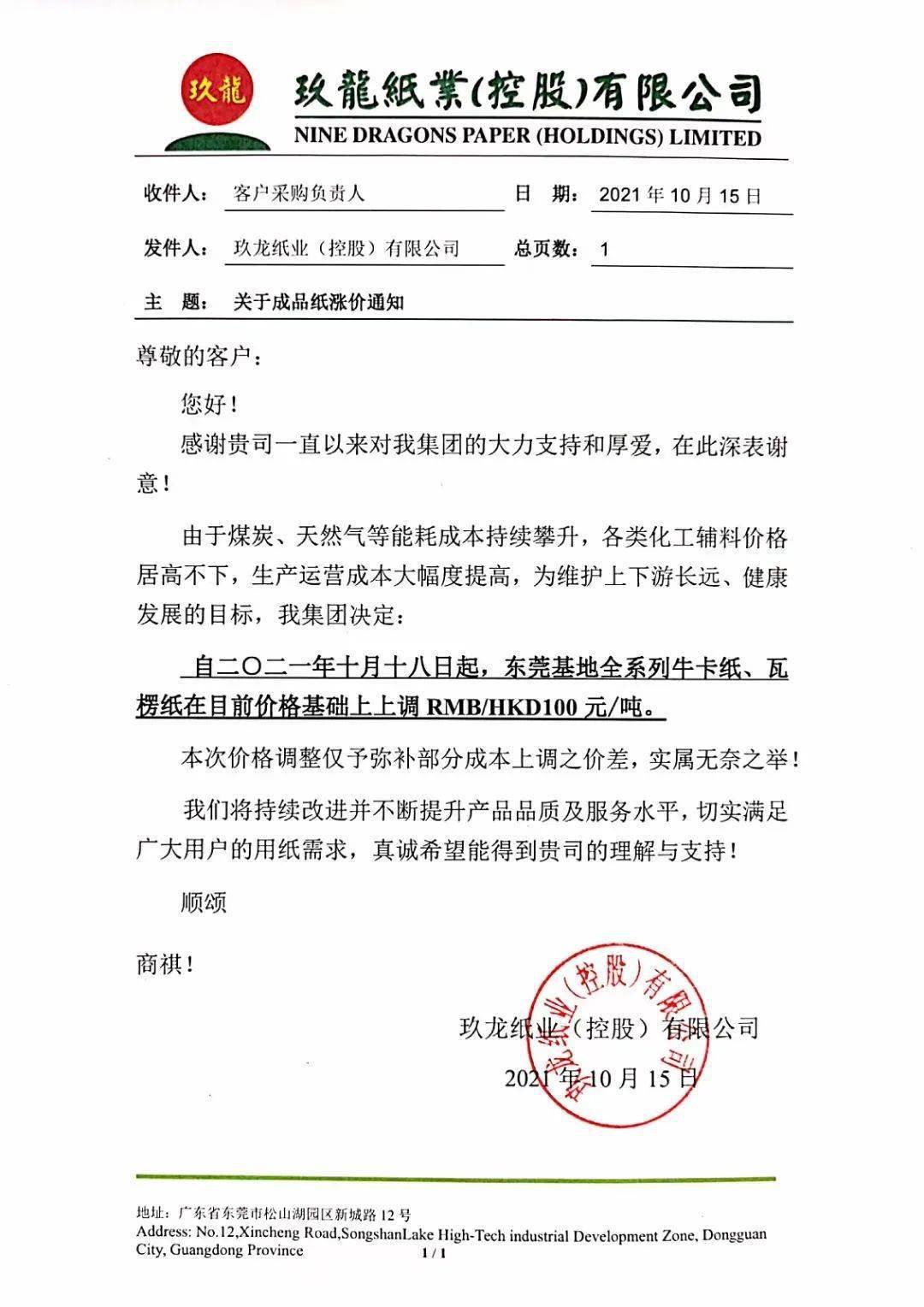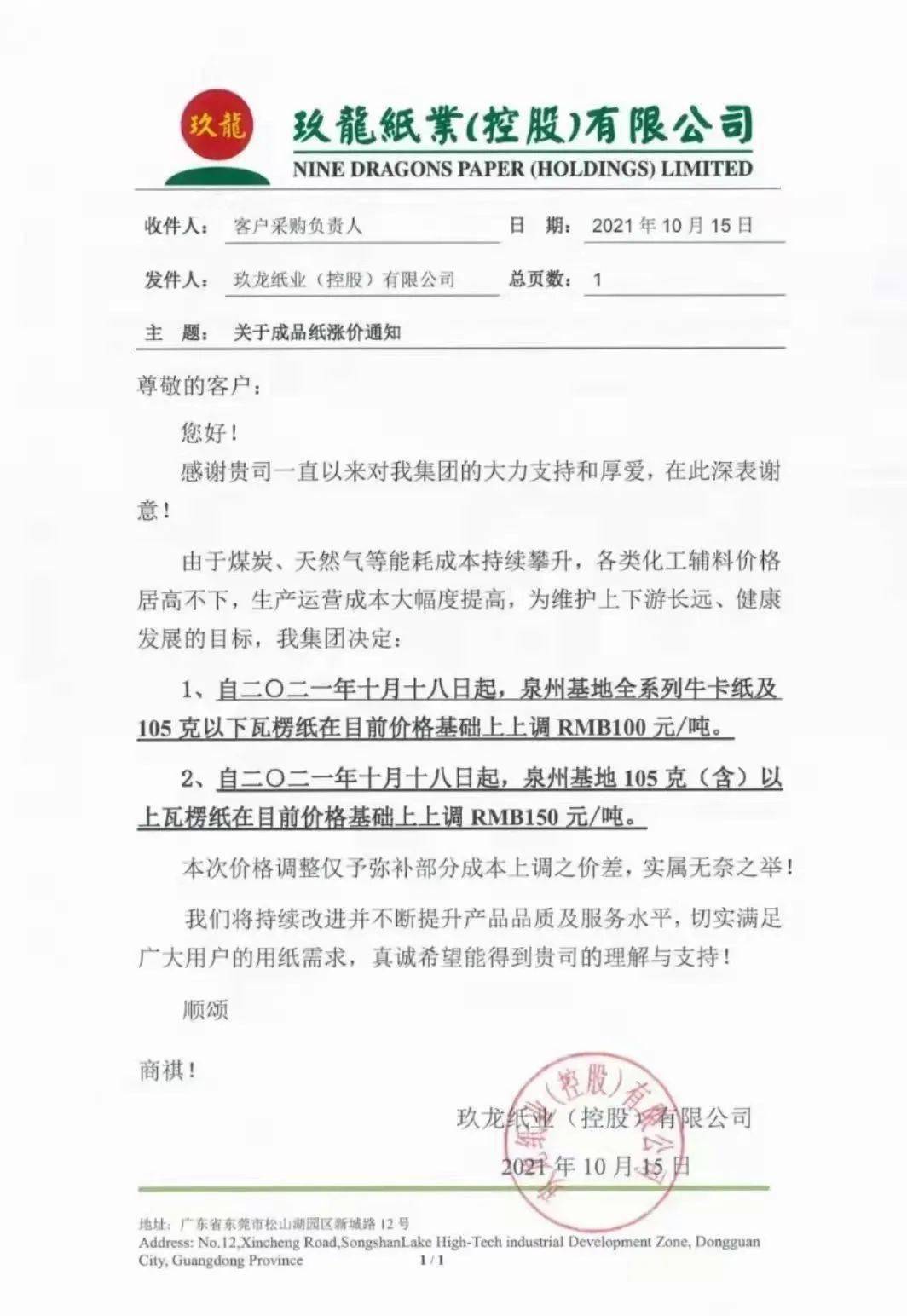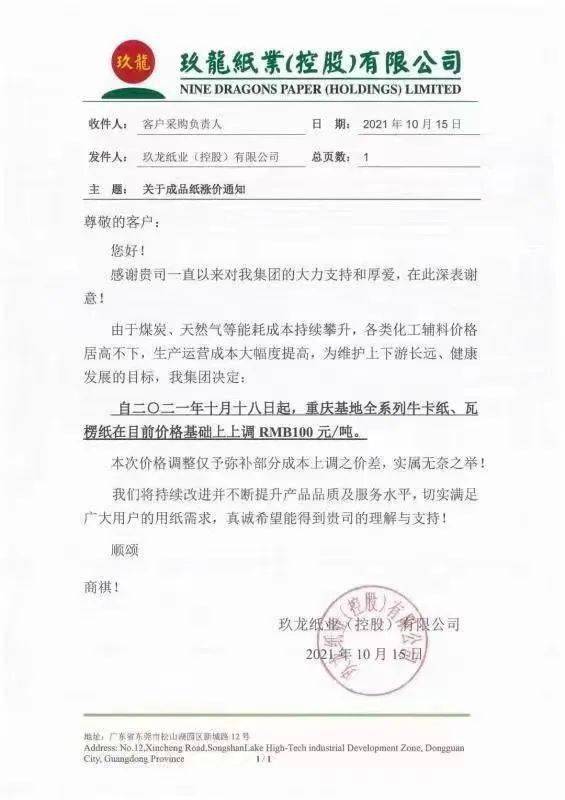 重庆玖龙:10月18日起,灰底白板纸、白面/涂布牛卡纸上调RMB 100元/吨 (11日涨价函)。全系列牛卡纸、瓦楞纸上调RMB 100元/吨。