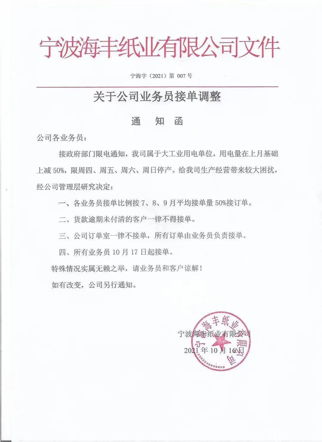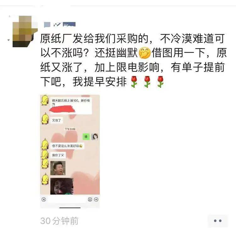 玖龙的这一轮涨价,可谓让下游包装企业情绪崩溃。由于限电停产,许多地方小纸厂都被迫停工,造成部分纸种供不应求,甚至传出纸板厂因为买不到纸被迫停工的传闻。就算不停产,对于中下游企业也强势起来。这是某位二级厂经营者朋友圈: