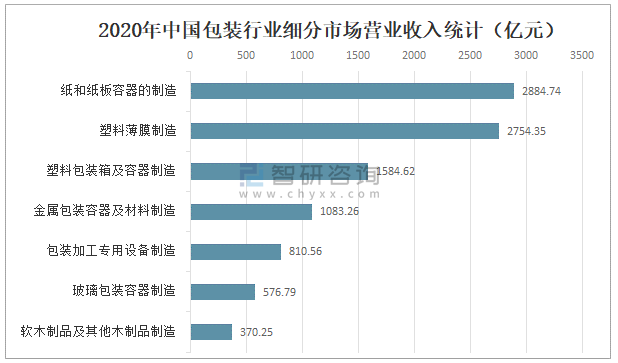 2020年中国包装行业细分市场营业收入统计(亿元)