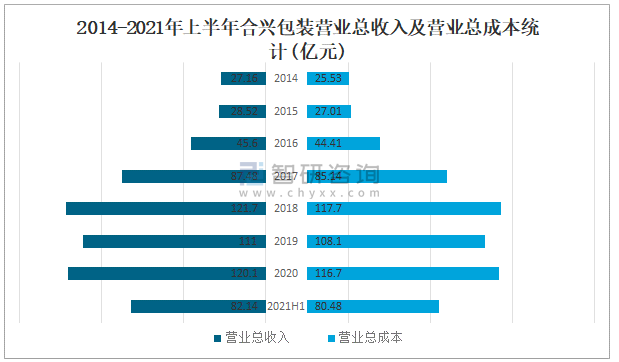 2014-2021年上半年合兴包装营业总收入及营业总成本统计