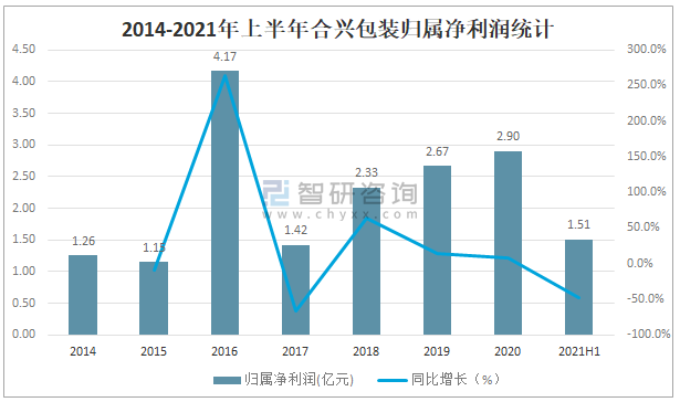 随着合兴包装营业收入的增加,归属净利润也随之增长,2020年合兴包装归属净利润达2.90亿元,较2019年增加了0.23亿元,同比增长8.7%,2021年上半年合兴包装归属净利润为1.51亿元。