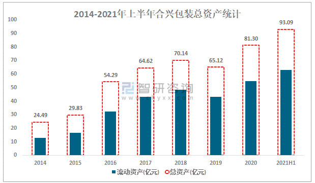 从总资产来看,2020年合兴包装总资产达81.30亿元,较2019年增加了16.18亿元,同比增长24.8%,2021年上半年合兴包装总资产已达93.09亿元,其中流动资产为63.21亿元。