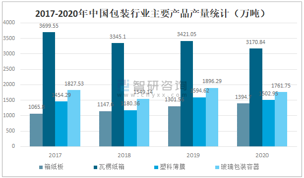 2017-2020年中国包装行业主要产品产量统计(万吨)