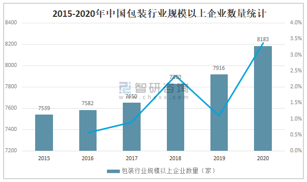 改革开放近40年来,伴随着我国经济的飞速发展,我国包装行业也取得了突飞猛进的进步。较为完整、门类齐全的包装工业体系已经基本建立起来,我国包装行业经历了高速发展阶段,目前已经成为全球发展最快、规模最大,最具潜力的包装市场,2020年中国包装行业规模以上企业(年营业收入2000万元及以上全部工业法人企业)8183家,较2019年增加了267家,同比增长3.4%。