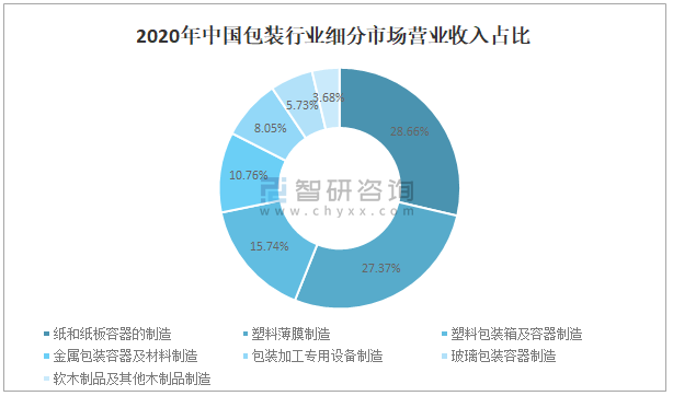 2020年中国纸和纸板容器的制造市场营业收入占包装行业营业总收入的28.66%,占比最大;塑料薄膜制造市场营业收入占包装行业营业总收入的27.37%;塑料包装箱及容器制造市场营业收入占包装行业营业总收入的15.74%;金属包装容器及材料制造市场营业收入占包装行业营业总收入的10.76%;包装加工专用设备制造市场营业收入占包装行业营业总收入的8.05%;玻璃包装容器制造市场营业收入占包装行业营业总收入的5.73%;软木制品及其他木制品制造市场营业收入占包装行业营业总收入的3.68%。