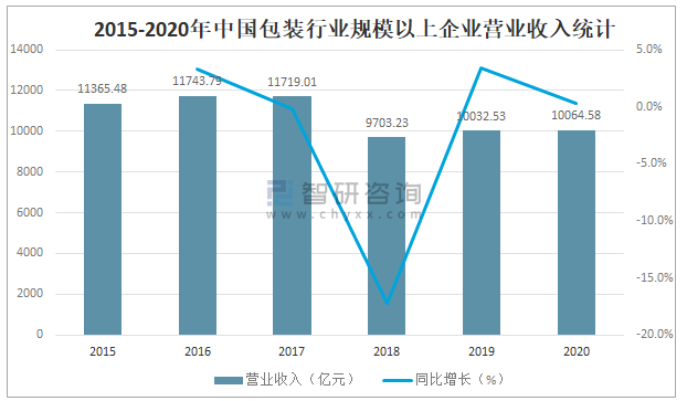 智研咨询发布的《2022-2028年中国包装行业发展现状调查及市场分析预测报告》数据显示:2020年中国包装行业规模以上企业营业收入稳中有升,2020年中国包装行业规模以上企业营业收入达10064.58亿元,较2019年增加了32.05亿元,同比增长0.3%。