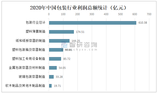 随着中国包装行业规模以上企业营业收入的增加,利润总额也随之增长,2020年中国包装行业累计完成利润总额610.38亿元,同比增长24.90%,其中塑料薄膜制造业利润总额完成174.51亿元;纸和纸板容器的制造业利润总额完成144.25亿元;塑料包装箱及容器制造业利润总额完成98.86亿元;塑料加工专用设备制造业利润总额完成85.72亿元;金属包装容器及材料制造业利润总额完成54.05亿元;玻璃包装容器制造业利润总额完成33.28亿元;软木制品及其他木制品制造业利润总额完成19.71亿元。